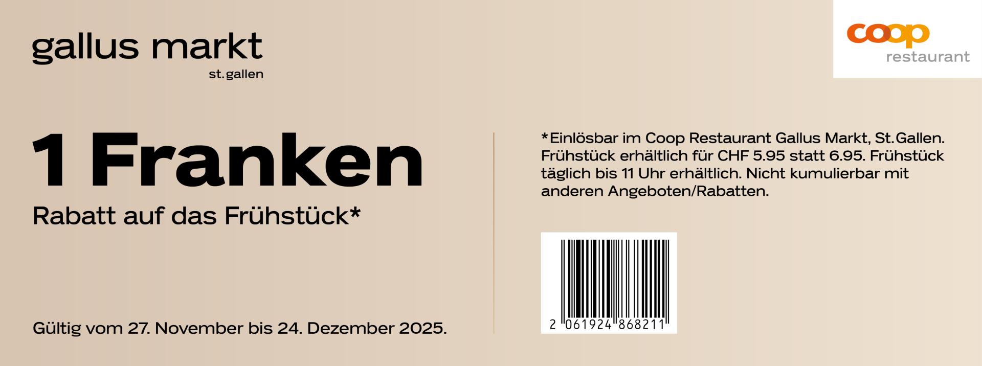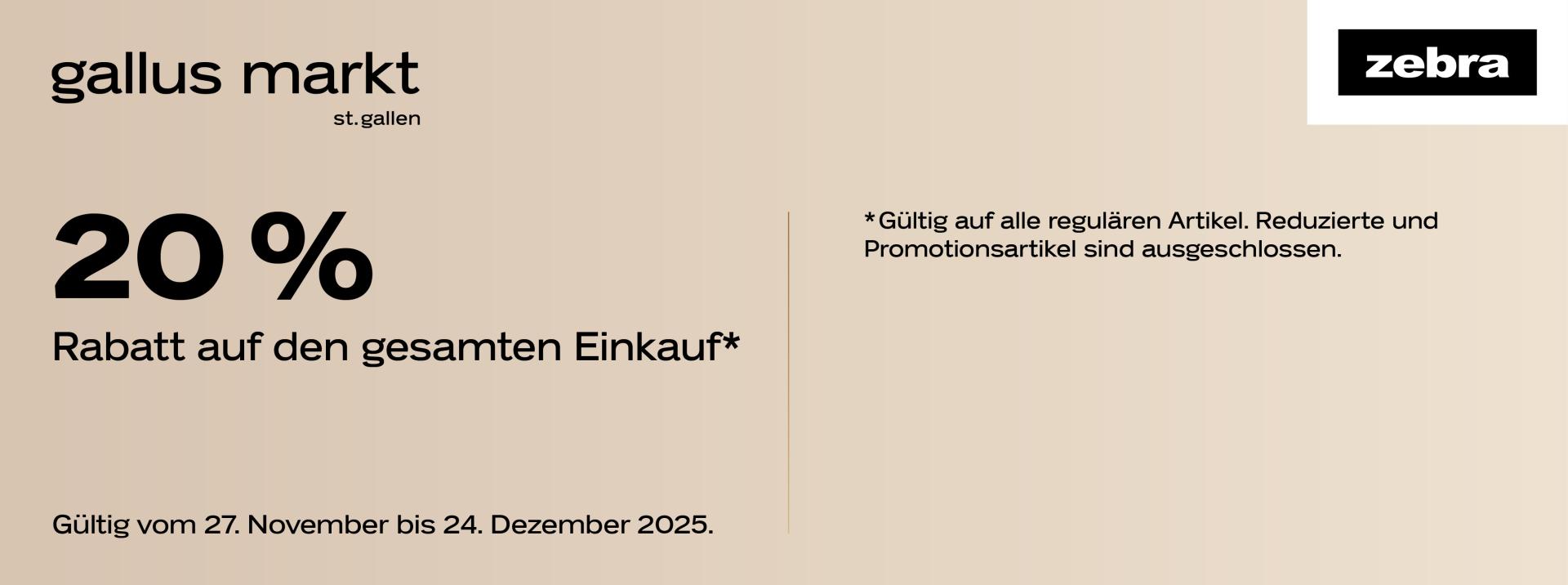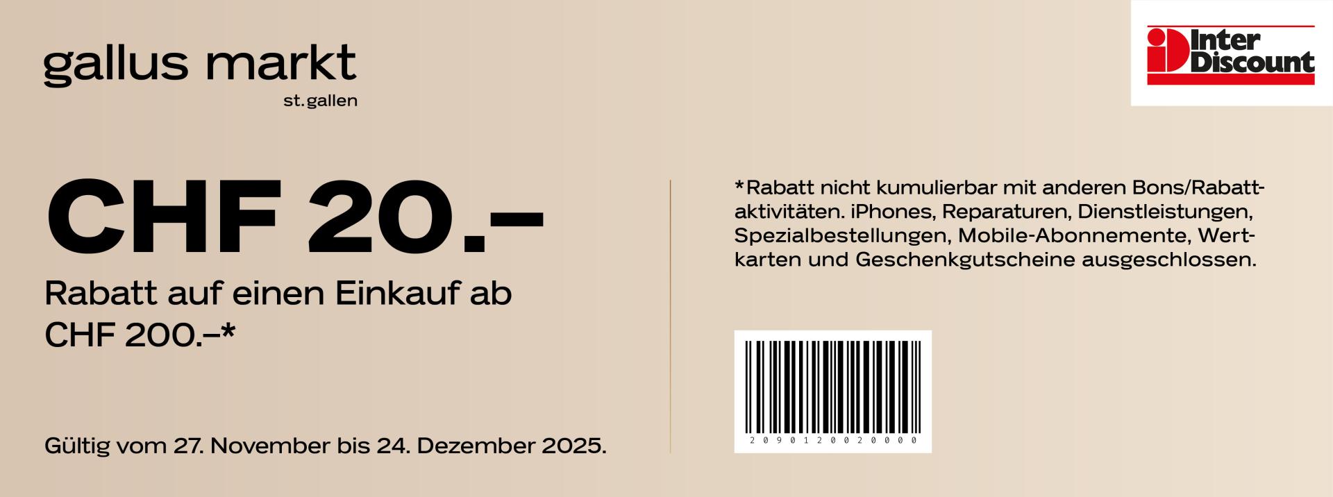 | Geschenkt: Coop-Geschenkkarte im Wert von CHF 20.- ab einem Einkauf von CHF 100.- bei Jumbo und Coop Megastore im Einkaufszentrum Gallus Markt St. Gallen. | 12.00 | bis | 17.00 |
